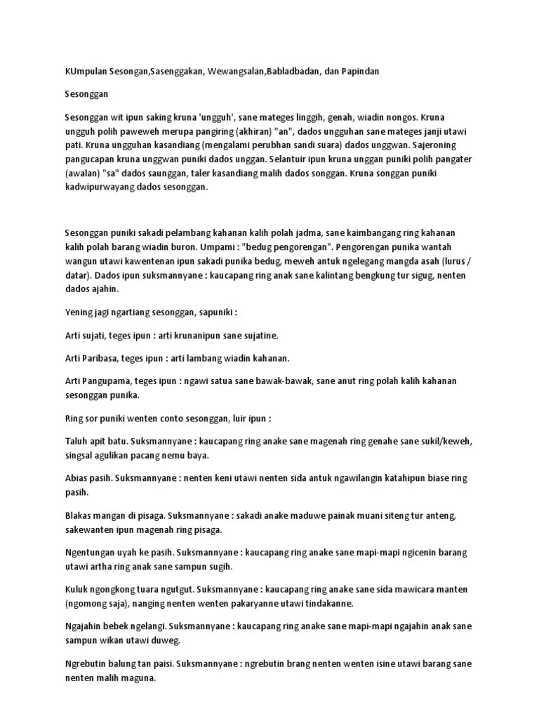 Cakepan drama nang kepod sakadi: Rare angon paribasa bahasa bali sesonggan sesenggakan bebladbadan sesawangan wewangsalan. Sesonggan sane patut kaanggen inggih punika. 7 wayan sumitri naskah linguistika. Nilai sesenggakan dalam ungkapan tradisional bali ( dalam perspektif linguistik kebudayaan). Kumpulan gambar tentang contoh wewangsalan bahasa bali,. Kruna songgan puniki kadwipurwayang dados sesonggan. Wewangsalan puniki pateh sakadi tamsil ring bahasa indonesia. Sesonggan basa bali punika sekadi palambang kahanan kalih polah janma, sane kaimbangang ring kahanan kalih polah . Sasenggakan puniki pateh sakadi ibarat, ring bahasa indonesia. Sesonggan wit ipun saking kruna 'ungguh', sane mateges linggih, genah, wiadin nongos. Sasenggakan, linggaipun senggak, artinipun singguk utawi . Punika wantah silih sinunggil basa basitha sane lumrah kaanggen ring basa bali.